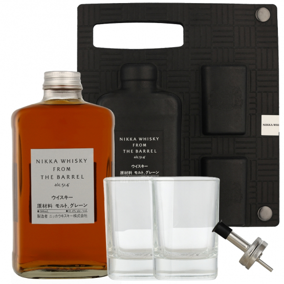 This gorgeously presented gift set from Nikka includes two sleek glasses, a speed pourer and a bottle of Nikka From The Barrel. The whisky is a combination of various malt and grain whiskies that Nikka carefully selects and blends, then ages in previously used casks for 3 to 6 months to achieve a harmonious balance.